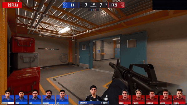 来到下半场第一个长枪局,CT开局ABgo,decenty拿到断A的寒王人头,随后又来到K1配合大仓和正门队友于外场把人杀完,比分8-7。经济被打崩溃的FaZe连续丢分。第十八回合,土匪想外场正门夹A,土匪的搜点和补枪效率没有拉满被CT到处偷人头,虽然总监三杀但最后被管道上来的decenty补死,比分11-7。次回合,半起的土匪A区爆弹,但最后包匪被截,Fluxo拿到赛点。最终局,土匪给外场一线烟想下管道被CT找人杀,放下雷包土匪二打四人数大劣守包失败,Fluxo以13-7比分拿下胜利。