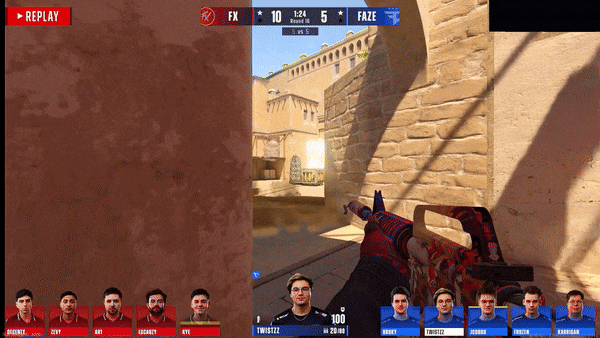FaZe先做进攻方。手枪局,CT四A反清中路拿信息,虽然拿到五打四优势,但埋伏在近点的总监连断两人,队友转A再清大坑一人,Twistzz三杀拿下手枪局。