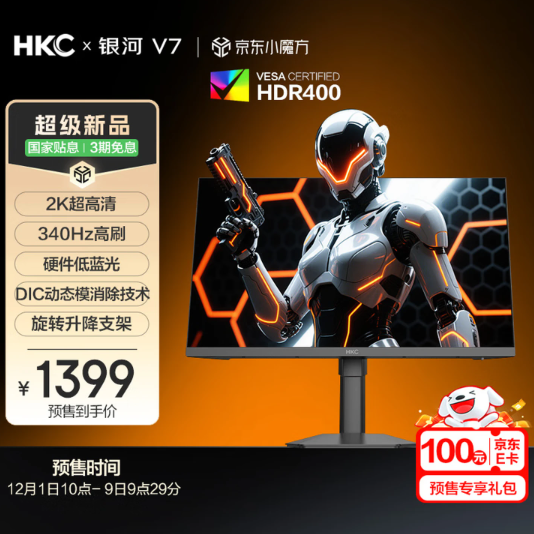 当 “高刷” 成为电竞显示器的核心刚需,多数300Hz以上规格的产品往往将价格锁定在2000元档,让预算有限的学生党、宿舍玩家望而却步。近日,HKC瞄准大众电竞市场推出全新机型——银河V7,以“27 英寸2K+340Hz极速刷新+ FAST IPS面板” 为核心配置,叠加95% DCI-P3广色域、HDR 400认证等素质,首发预售价仅1399元,直接将旗舰级高刷体验下放到入门价位,成为宿舍电竞与平民玩家的 “性价比新选择”。