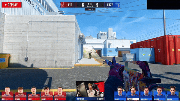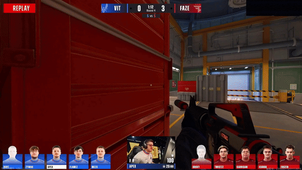 来到上半场第一个长枪局,双方在K1和铁门相继一换一,三打三拿到CT信息的土匪强打A区,放下雷包土匪率先落位架枪形成优势,比分6-9。第十八回合,虽然开局外场karrigan漏身位送出首杀,但CT直接赌四A赌对,frozen和jcobbb双人四杀打崩对手经济,比分11-7。最终局,箱神外场大狙先拿apEX首杀,随后土匪进攻A区意图暴露,包点jcobbb配合broky双人五杀,FaZe以13-7比分拿下胜利。