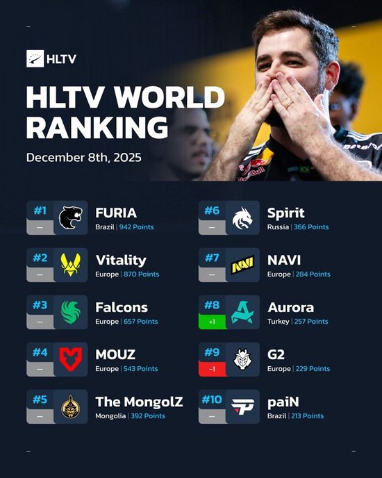 1-10名中,FURIA依旧高居王位,Aurora前进1名,和后退1名的G2进行了换位,除此之外其余强队各自稳坐高台。