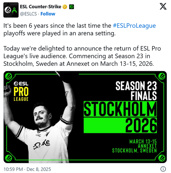EPL S23主办方宣布,本届赛事的淘汰赛阶段将重回实体场馆举办。赛事运营方已通过官方社交媒体账号发布该消息,而上一次EPL在实体场馆举办赛事已是六年前。