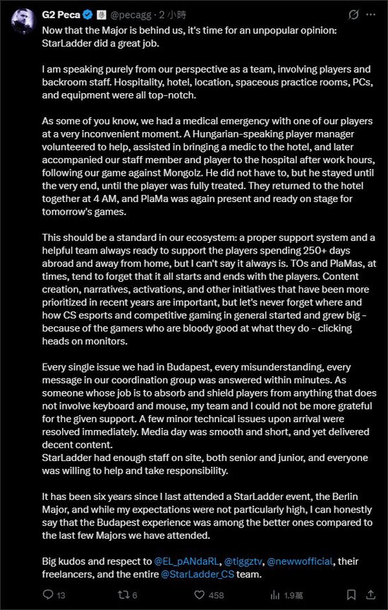 随着StarLadder布达佩斯Major的落幕,各方的复盘与评价纷至沓来。在一片常见的赛后讨论中,G2经理Peca在社交平台发布推文,基于团队亲身经历、对赛事主办方StarLadder的高度赞扬,并洋洋洒洒地表达了他对整个电竞赛事生态重心的思考。