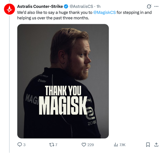 Magisk同样结束了在Astralis的第二段生涯。这位步枪手于今年9月因stavn个人原因暂离队伍后重新加入,曾助力队伍晋级裂变天地S2与IEM成都2025淘汰赛,并出战了StarLadder布达佩斯Major。