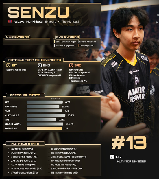 此前,来自全亚洲战队的选手(更不用说蒙古选手)从未入选过HLTV年度TOP20选手榜单,但Senzu的辛勤付出改变了这一现状。这位19岁的开场突破手在The MongolZ令人难忘的BLAST.tv奥斯汀Major总决赛征程中,以全年4次EVP和1.30 rating的顶级表现,成功跻身HLTV 2025年度最佳选手榜单。