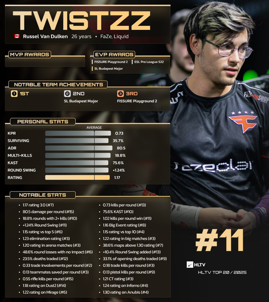 2021年初,这位加拿大选手转会至FaZe战队,并在此后两次入围TOP20。2023年底,他重返Liquid,但这段北美之旅并未重现往日辉煌。不到两年后,Twistzz再度回归FaZe,凭借赛季末的绝佳状态,在缺席榜单一年后第六次跻身TOP20行列。
