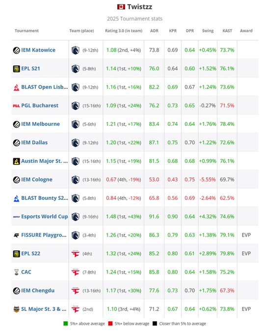 北美战队在IEM达拉斯站再度折戟小组赛,仅在对阵FaZe时拿下一胜。该场比赛中Twistzz贡献1.38 rating、91场均伤害及+2.66回合贡献差,再度以队内最佳表现结束赛事。他在BLAST.tv奥斯汀Major(1.15 rating)重现了同样的孤勇,但Liquid以0胜3负的战绩出局,带着这位加拿大选手口中“年度最失意时刻”的阴霾进入夏季休赛期。