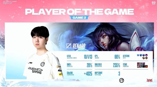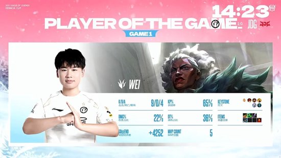 iG打野选手Wei凭借连续三把的亮眼表现,斩获本次德杯的FMVP荣誉。