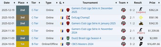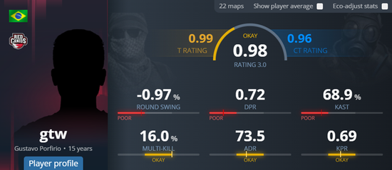 gtw今年年仅15岁,他的职业生涯开始于2024年底。刚出道的他便效力于RED Canids青训队至今,期间曾短暂亮相主力阵容,随队拿到过CBCS大师赛2024冠军(B级赛事),但仅出战过七张地图。回到青训队后,也带队拿到了Liga玩家俱乐部2024系列赛A十一月杯等1冠2亚(C级赛事)。