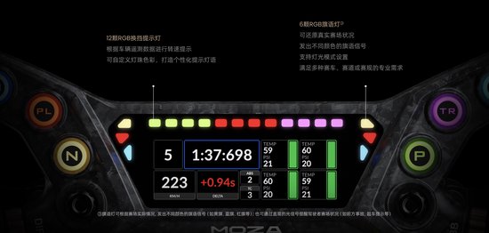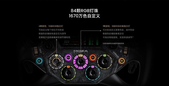 专业的灯效设置,真实还原赛场状况。高达84颗RGB灯珠,均支持1670万色色彩自定义,点亮时如繁星璀璨,呈现令人惊叹的科技视觉震撼。玩家用户可根据个人需求打造个性化的提示灯语,借助色彩辅助快速拆解赛场信息、灵活调整操控策略,满足对多种赛车、赛道及赛规的专业需求。