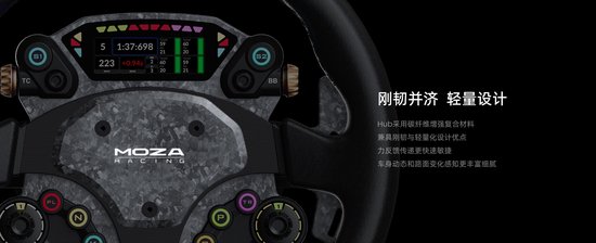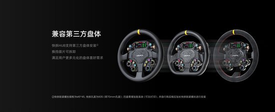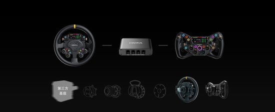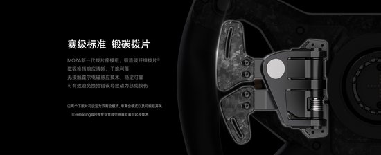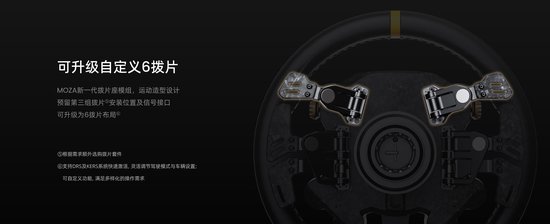 HUB支持快速拆卸,可兼容安装第三方盘体,玩家可以根据自己的喜好更换不同盘体,满足了热衷DIY及个性盘体材质的玩家需求。MOZA新一代拨片座模组,采用可拆卸锻造碳纤维拨片、磁吸换挡结构及无接触霍尔感应技术,响应快速清晰、稳定可靠。此外,还预留了第三组拨片的安装位置及信号接口,用户可根据个人需求升级为6拨片布局,体验更加专业的竞技操作。