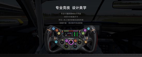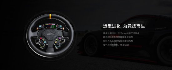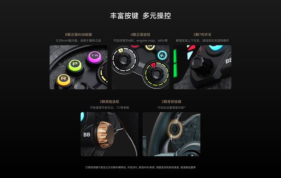 整盘配置了10颗正面RGB、0.25mm短行程按键,4颗12段旋钮、1颗8段旋钮、4颗拇指波轮、2颗7向开关及2颗背部按键,几乎涵盖了模拟赛车竞技中所有可能用到的功能,操控性能更加出众。