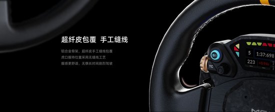 MOZA CS Pro方向盘为325mm标准尺寸竞技圆盘,按键和面板造型以GT3赛车风格为灵感进行了创新融合,运动感十足。用料细致考究,铝合金骨架搭配碳纤维增强复合材料HUB,兼具刚韧与轻量化的设计优点,有效提升玩家对车身动态和路面变化的感知。超纤皮质环身包覆,虎口握持位置采用无缝线工艺,握感舒适,无惧长时间剧烈驾驶。