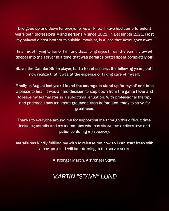 他在宣布回归的声明中详细说明了离场原因:“2021年12月,我挚爱的兄长因自杀离世,这份伤痛永远不会消逝。”stavn坦言,“当时我试图用赛场表现纪念他,将自己深深埋入训练之中,同时逃避痛苦,或许那段时间本应彻底休整。作为职业选手的stavn在随后几年取得了巨大成功,但我现在意识到,这是以透支自我为代价的。”