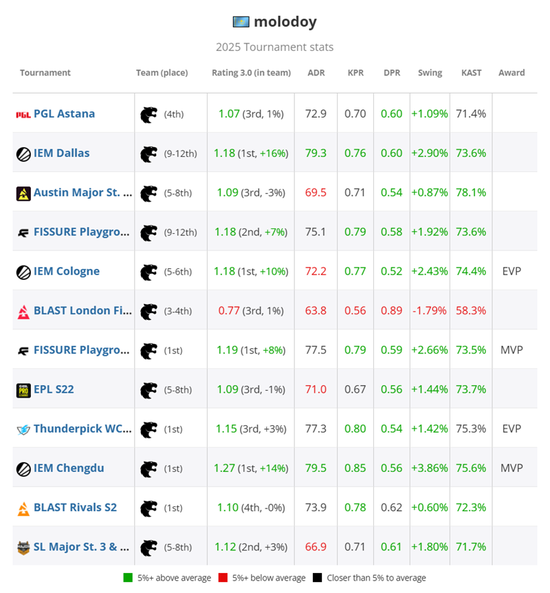 molodoy本次赛事表现稳定但缺乏往常的巨星锋芒,最终以1.10的平均rating(队内第四)结束征程。他在获胜地图中仅取得1.06的rating,这也使他与个人年度第三个EVP奖项失之交臂。