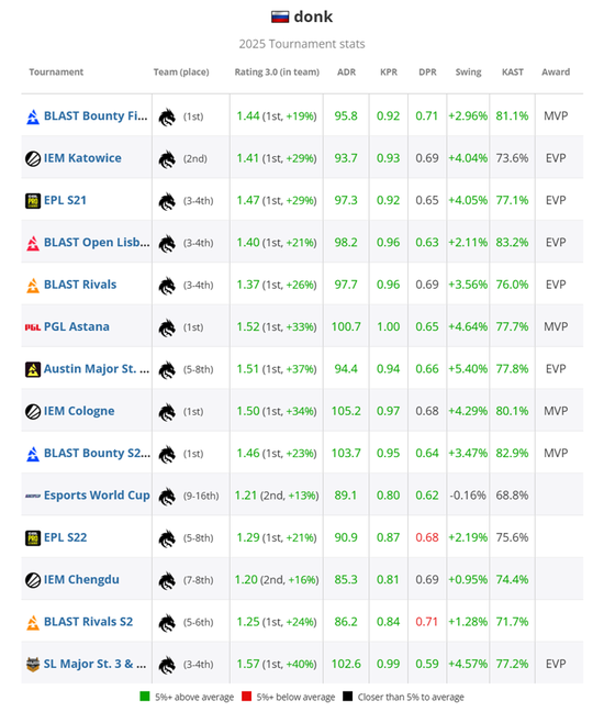 这场失利终结了队伍本赛季征程,也创下团队迄今最差战绩。而donk却延续着他恐怖的稳定性,在赛季七项赛事中第七次荣获奖项,以整个赛事1.51 rating的碾压级表现将队友远远甩在身后,强势入选EVP榜单。
