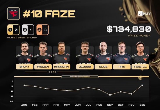 正是这次Major征程将FaZe锁定在年度前十。若非他们在BLAST.tv奥斯汀Major的阵容(核心并非broky、karrigan和frozen)不被计入该排名核心评定,他们本可位列第九。