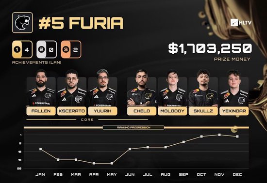 尽管在那场Major中止步八强,但这一年无论如何都已转变为成功的一年。年初的糟糕开局让FURIA相比榜单前列队伍有太多差距需要弥补,但他们在年末的强势冲刺,以及在IEM成都站的巅峰表现,足以让他们超越Falcons,位列第五。