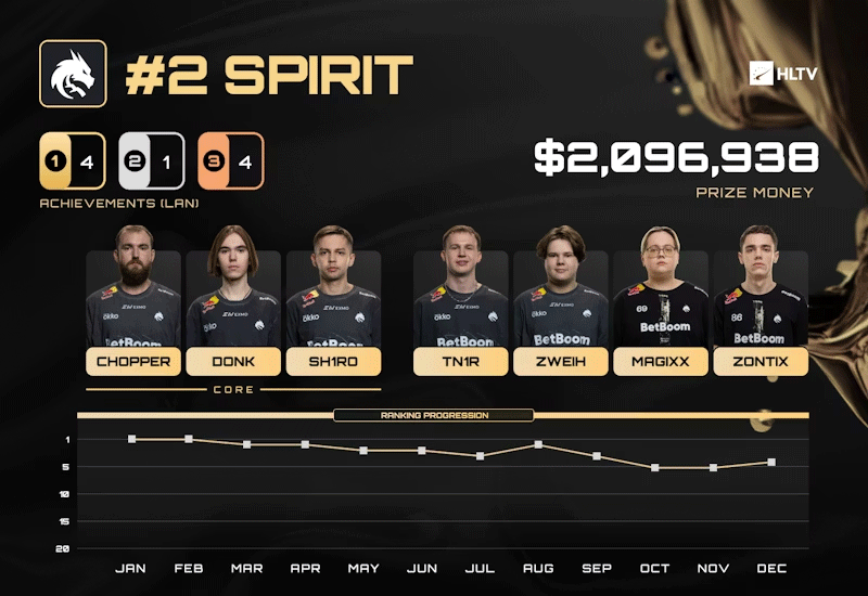 因此,Spirit在状态不佳的情况下进入StarLadder布达佩斯Major,但他们一扫所有担忧,以令人信服的方式轻松横扫晋级淘汰赛,并在此过程中击败了MOUZ,一路杀入半决赛。Vitality再次终结了Spirit的征程,但四强的成绩为Spirit整体上高光的2025年画上句号——他们全年赢得四座奖杯,并稳固地确立了自己年度第二战队的地位。