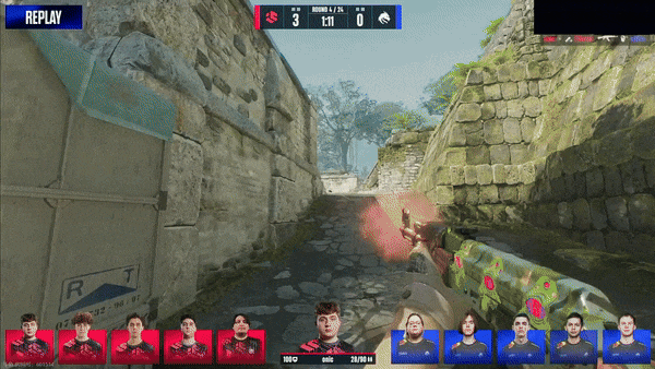 Spirit先做进攻方。手枪局,土匪抢A大,放下雷包四打四,A小回防zeRRoFlX三杀拿下手枪局。