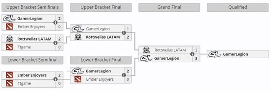 虽然GamerLegion是北美赛区唯一一支职业队伍,但他们本次出线并不顺利。在胜者组他们就1-2不敌Rottweilas LATAM。Rottweilas LATAM由巴西选手Costabile和四名秘鲁选手组成,Costabile曾参加过TI10和TI12,在巴西选手中也是老大哥一样的存在。来到北美赛区参加预选,给“地头蛇”GamerLegion带了不小阻碍。