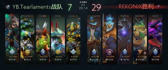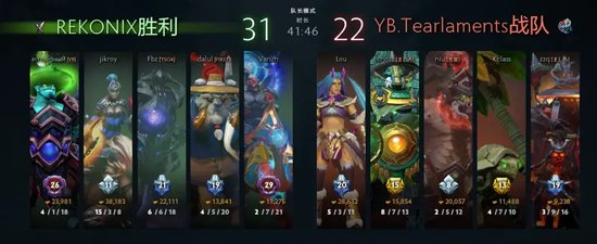 首局Rekonix一号位露娜阵容前期无解发育,中期连续控盾推塔,YB.Tearlaments没能干扰对手游戏进程,多近战阵容在露娜成型后被平推。