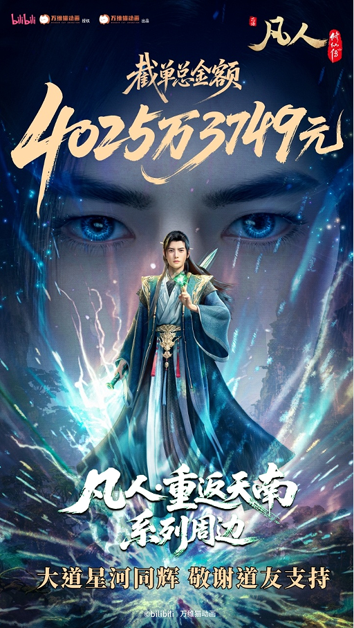 在商业价值上,《凡人修仙传》动画无愧《雷报》半月奖“2025最具商业价值动漫IP”认证,“重返天南”系列众筹周边截单总金额突破4025万,创国产动画周边金额新纪录,《凡人修仙传》动画视听音乐会门票更是在上线1小时内全部售罄,形成优质内容与商业消费相互促进的良性生态。