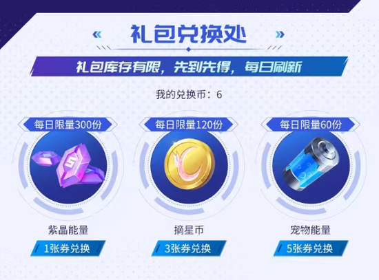 兑换区涵盖紫晶能量、摘星币、宠物能量等多种实用道具,不同道具需对应数量兑换券兑换,每日限量供应,兑完即止!