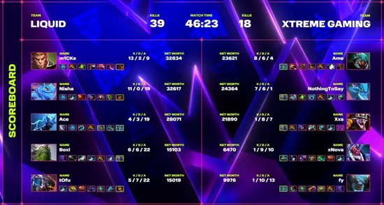 对线期XG在优势路小优,中路NothingToSay的拉席克单压了Nisha的帕克,但劣势路伐木机和裂魂人面对齐天大圣和杰奇洛完全没法玩。对线期后Liquid就发起的快攻,齐天大圣不断参战,12分钟就做出黯灭。此后Liquid就进入了熟悉的进攻节奏,XG几次还手都以失败告终,XG众人逐渐经济崩盘,只有编织者勉强跟上齐天大圣。Liquid利用一代盾持续压制,将经济差拉开,等到帕克带上二代盾后又毫无压力拆掉XG中路。42分钟Liquid抓掉伐木机,随后拆掉下路,编织者开启BKB撒旦强拼掉雷泽,但也无法阻止后排被切。拆掉下路后Liquid又一波回马枪击杀没有BKB的编织者,编织者买活后伐木机已被集火击杀,匆忙迎战自己也倒下,XG只能打出GG。