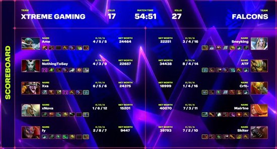 对线期双方优势路都小压对方劣势路,而中路Malr1ne的莉娜单压了NothingToSay的痛苦女王,XG对线小劣。对线期后XG利用痛苦女王和矮人直升机的积极参战打回线上劣势,并且打魔方控盾。但此后Falcons选择避战发育,XG只有莱恩一个先手,多次进攻未果,甚至强行开团导致阵型和技能交接混乱,被Falcons完成反打,几波下来XG经济落后了9000。此后Falcons控下二代盾,虽然Skiter熊战士一波冲高白白送盾,但Falcons还是凭借对地图的控制不断拉开经济差距。47分钟Falcons抓掉痛苦女王,破掉XG上路,随后在高地上利用装备优势打赢团战,破掉XG剩余两路。绝境之下矮人直升机买出圣剑依然没能打赢团战,XG还是打出了GG。