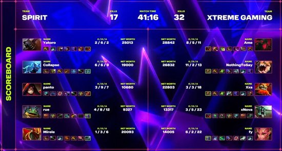 对线期XG的中路和劣势路都小劣,优势路影魔和雷泽打成互穷,影魔经济略微领先。对线期过后XG利用獸和玛尔斯的强势接连发起进攻,而Spirit则依靠Collapse早早笛子的雷泽顶住局势,双方一号位均几次被击杀。雷泽笛子后很快又做出赤红甲,Spirit打掉肉山熊战士带盾。但Spirit集合推进下路时,Yatoro熊战士被fy邪影芳灵一套小技能就打出大招。XG见熊战士没大,开雾追出来先手龙骑士将其秒掉,又将熊战士击杀两次,Collapse的雷泽配合术士链接勉强换掉XG三人,XG这波在经济劣势下打出3换3外加一个盾,还是大赚。二代盾刷新后,双方围绕肉山坑交换半区僵持了很久,Spirit中单小将的龙骑士早早开过变龙,变龙快结束时Spirit按捺不住选择打盾,XG直接先手秒掉熊战士,Collapse的雷泽和Ame影魔强行1换1,Spirit依然被五人全灭,XG等到影魔复活后轻松拿下肉山。随后双方又在二代魔方处交战,Yatoro熊战士不管不顾一个人打掉影魔的盾,Spirit阵型全乱,残局中龙骑士跳晕影魔后原地TP,XG一拥而上团灭Spirit,又是一波1换5。XG已然大优,只等着下一个肉山终结比赛。三代肉山刷新后Spirit不肯坐以待毙,中路龙骑士跳晕玛尔斯后被NothingToSay的獸反手抱住,影魔几巴掌拍死,Spirit直接溃败五人团灭。XG中路直扑基地,Spirit只能打出GG。