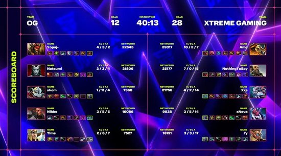 对线期双方并没有拉开太大差距,7分钟痛苦女王带队想抢XG的经验神龛,虽然抢经验得手,但昆卡和干扰者及时支援击杀OG三人。此后双方各有主动进攻,但也不过小打小闹。随着兽王做出A杖,OG进入强势期,打掉肉山后又抓掉XG双酱油,控下了魔方。不过OG整体控图和进攻效率低下,XG的发育并未被干扰。25分钟OG下路动手干扰者,XG全员在场发起反打,斯拉达吃掉兽王大招后克林克兹有了输出空间,OG再想集火克林克兹,又被飓风长戟和隐身拉扯,慌乱中被NothingToSay的昆卡船中多人,XG打出一波3换5确立了优势。30分钟OG斧王先手克林克兹被Ame克林克兹开出BKB,XG又是一波反打完成0换4,随后打掉二代肉山为克林克兹带上不朽盾。带盾之后XG两路开花抓掉发条技师和兽王,轻松破掉一路高地。39分钟又一波团战取胜后,XG拿下本场比赛。