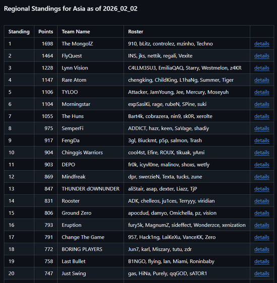 直邀战队是根据截止至2026年2月2日的Valve亚洲区积分排名邀请的。由于本次大洋洲赛区报名开启时间较早,多支队伍未能在时限内完成报名,导致海选阶段名额空缺。为保证赛事结构完整,主办方将依据积分排名顺延邀请1支队伍加入正赛,使本次亚洲预选赛的直邀队伍达到5支。