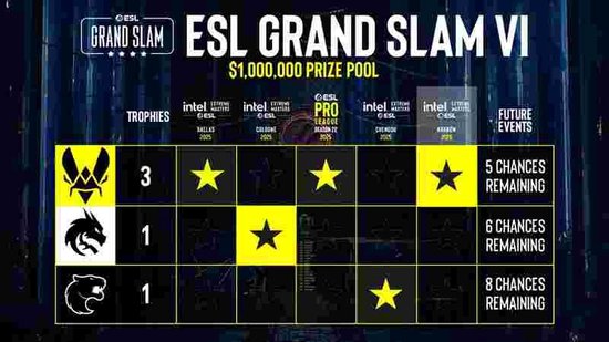 2025年5月,Vitality夺得IEM达拉斯 2025后步入ESL第六季大满贯行列。之后他们取得EPL S22和IEM克拉科夫 2026,如今只需在接下来的五个赛事(IEM里约 2026、IEM亚特兰大 2026、IEM科隆 Major、EPL S24、IEM中国 2026)中任意夺得一个冠军即可达成背靠背大满贯成就。