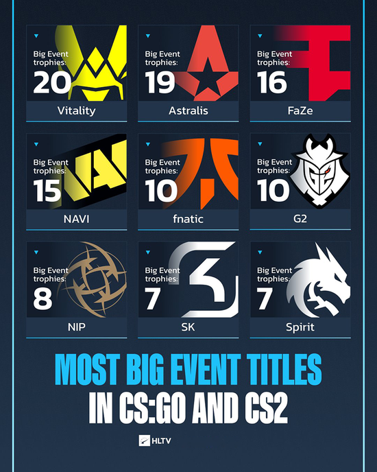 Astralis曾一共取得过19座大赛冠军,如今Vitality已成功拿下20座大赛冠军,而鉴于Vitality仍处于鼎盛时期,这个纪录预计将继续扩大。除了Astralis以外,排在第三位的是FaZe,他们队史一共取得了16座冠军。Natus Vincere、fnatic、G2、Ninjas in Pyjamas等队伍均榜上有名。