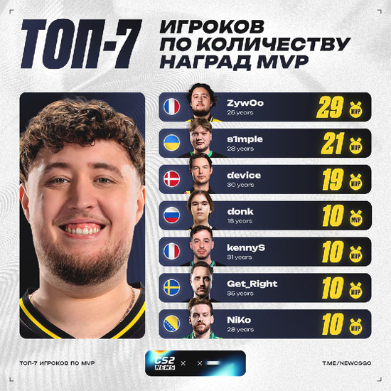 在IEM克拉科夫 2026夺冠后,ZywOo的CS生涯MVP数量来到了29个,已早早领跑MVP榜,并领先第二名s1mple多达8个MVP。