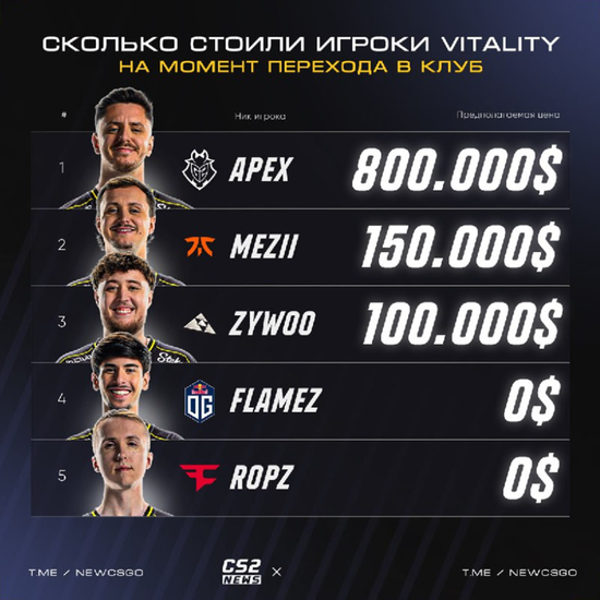值得一提的是,花了重金投入的石油战舰Falcons,据传闻光是购买最新加入的kyousuke便花费200万美元(Falcons管理层表示花了大价钱,但不足200万)。而据OverDrive爆料,m0NESY的转会费也达到了惊人的200-250万美元,也是Vitality全队转会费的两倍以上。