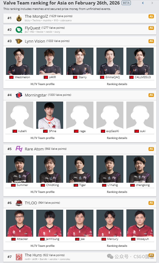 2026年科隆Major的亚洲晋级名额为5个,也就是说在2026年4月初V社公布的VRS排名时,VRS亚洲榜前5战队才能晋级Major。目前亚洲榜实时排名LVG位居第3,Morningstar第4,RA名列第5。而TYLOO排在第6位,暂时处于晋级线外。
