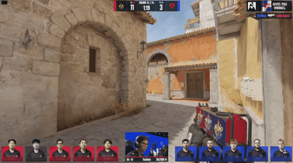 第九局,意识到MongolZ不会回防B点的MOUZ在香蕉道打掉一人后继续进攻B区,这一次Techno4K依旧没能换到人,MOUZ再得一分。连续丢分的MongolZ想打非常规,随后两局MongolZ连续中路前顶打了MOUZ一个出其不意,连得两分。上半场结束,MongolZ以9-3大比分领先。