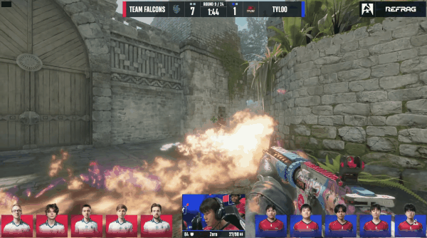 第九局,Falcons强起三人赌B都没能守住,TYLOO取得领先。这下Falcons需要eco,第十一局,kyxsan在沙袋终于做出贡献,配合队友闪光弹双杀清空香蕉道,剩下CT想进攻A点也被Falcons化解,Falcons终于拿下第五分。最后一局,TYLOO想从连接走警家,Zero三杀将警家三个CT全部秒杀,TYLOO拿下最后一分,上半场以7-5暂时领先。