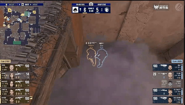 图二是Spirit选择的Dust2,Liquid选择CT开。手枪局Spirit出A大,malbsMd全白先收首杀,随后A大混战Liquid枪法爆发拿下第一分。第三局,malbsMd跟闪刷A门清掉tN1R。最后20秒土匪假A真B,但CT完全不吃骗,轻松取胜。下一回合,Spirit强起局选择中速夹B,donk和tN1R的手枪分别打出突破完成翻盘。第五回合,EliGE前顶B1先偷首杀。第二时间Spirit抱团进攻A大,EliGE和ultimate枪法爆发摧毁土匪。下一回合,donk中路化身推土机,暴力三杀将对方打入经济局。第九回合,donk A小手撕大狙完成一换一,随后双方A点大混战,最后zont1x面对1v2残局无力回天。下一回合,土匪中速进攻A大,magixx和tN1R轻松突破拿下第五分。上半场最后一分,donk和magixx中路先杀两人。第二时间土匪中夹B,回防的malbsMd中门连收两人,配合ultimate和EliGE的发挥完成3v5残局。上半场比分定格在6-6。