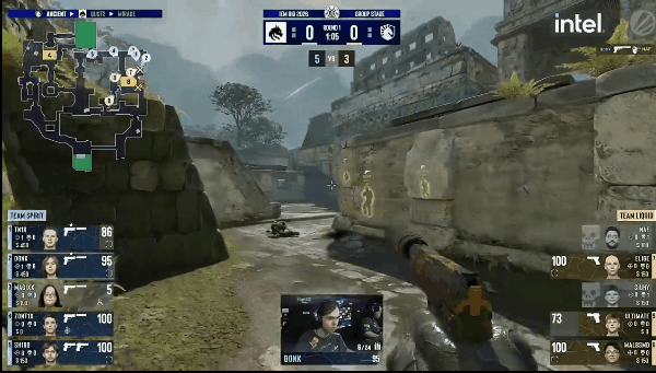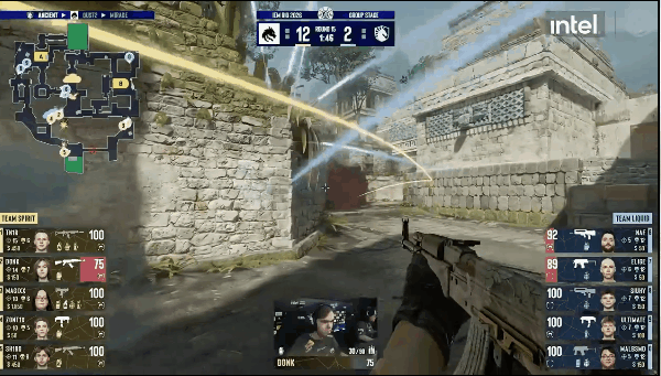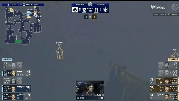 图一来到Liquid选择的Ancient,Spirit选择CT开。手枪局Liquid控中后转黑屋,CT后点防守,土匪免费占住包点。第二时间donk二道配合tN1R展开,完成双人五杀拿下手枪局胜利。第三局,土匪控中打成一换一,随后中速接触黑屋,siuhy三杀拿下第一分。下一回合土匪快出中路,人换人立马执行夹A。回防三打四的局面donk在遗迹连爆两人,成功回防。第七回合,土匪中速出匪口后转B坡集合一波,CT及时反烟,magixx和zont1x轻松架烟歼灭土匪。下一局Liquid半起局直接提B,一换一后占住包点。回防的sh1ro一波扫转加掩护拆包CT,完成三杀拒绝翻盘。第九回合,siuhy在黑屋先拿首杀,土匪顺势踩进B包完成0换3,拿下第二分。下一回合,土匪直接A点爆弹,完成一换一后进入守包环节。随后甜甜圈的donk再次爆发连收两人,轻松回防。上半场最后一分,Liquid众人各自为战,在地图的各个角落被逐个击破。上半场比分来到10-2。